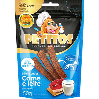 O Bifinho Petitos para Cães Filhotes Sabor Carne e Leite é ideal para filhotes, por estarem em fase de desenvolvimento estrutural. Contém prebióticos e zeólita que auxiliam na manutenção da saúde. Por conter minerais e fibra permite uma fácil digestão.
